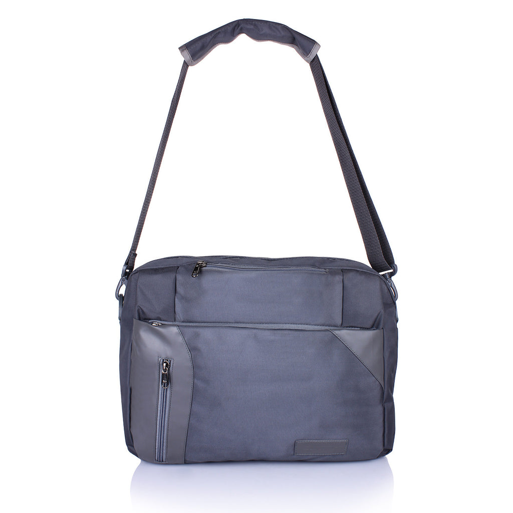 3-way Business bag with 15" laptop sleeve and removable/adjustable straps - Two zippered compartments, - Front two exterior pockets, - Adjustable, removable shoulder strap, - Optional, hidden backpack straps to wear as backpack - Interior features padded laptop for 15" laptop - Interior compartment features organizer panel with two slip pockets, mobile pocket, and pen slots.